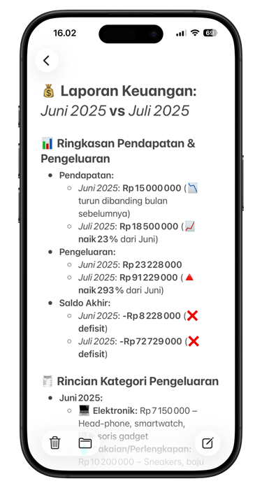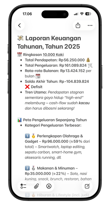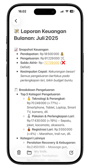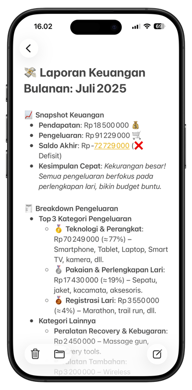Singkatnya ini adalah asisten AI yang bisa membaca pikiran uang Kamu. Dia mengambil semua data dari catatan harian dan menerjemahkannya menjadi: